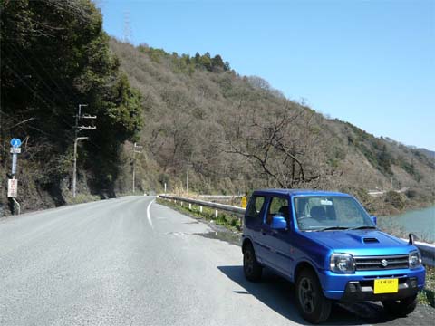 | 県道785号に入ってみると、かなり怪しい雰囲気の道。 この道、県道なのに、マトモに管理されて無いみたいで、この先で、木の枝が狭い道の真ん中に上からだら〜んと垂れていた。ルーフに傷をつけたくないので戻ろうか迷ったけど、何度か降りて確認しながら、ギリギリまで寄って何とかクリアした。(こういうとき、適度にボロイJA11だったらな〜と思う) |