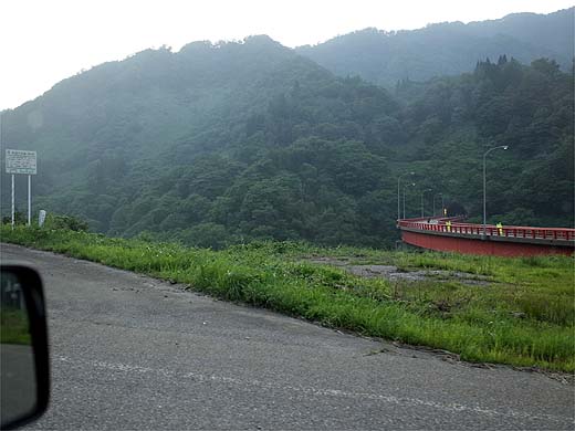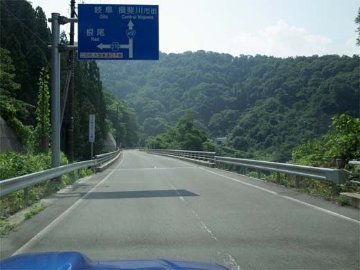 サービスの朝食を食べて、7:20出発! threetroyさんにルート選定を任せて、本日最初のイベント国道417号・冠山林道に向かう。 国道158号を西へ 「山ごもり」する前に、LAWSON福井篠尾店でパンと飲み物を買っておく。 福井県道31号福井県道31号篠尾勝山線から、福井県道18号鯖江美山線へ 福井市・鯖江市境の金谷(かなだん)トンネル 福井県道192号上河内北中線の終点から怪しげな道に入る。→ ココ (threetroyさんのルート選定デス。) ホントにコレっすか? どうやらこの道で正解らしいけど、雰囲気悪いなあ。 「こんな所通りたくないよぉT_T」 ←ジムニーの心の叫び 繰り返すけどルート選定はthreetroyさんです(^^) ちなみにこの道は↓のブログによると「上河内清根林道」というらしい・・・ http://blogs.yahoo.co.jp/rin7574/9002021.html 走行動画もありました http://www.youtube.com/watch?v=ge24wlE0gkY 福井県道2号武生美山線、国道476号を経由して、いよいよ国道417号へ しばらくは普通の道で山の中に入っていく。 センターラインがなくなって少しのところに橋台が現れた。建設中の冠山峠道路の橋かな? 8:42 たぶん、ここから先が冠山林道 数分前に走った道が見える。 だいぶ標高が高くなってきた。 残念な空だなぁ・・・ 晴れていれば見晴らしが良いかも知れない。 9:08 冠山峠に到着 標高1050mもあるのに、とても暑い。 晴れてればなぁ。。。 温見峠よりもコッチの方が落ちたら死にそう・・ 高倉峠方面は通行止め 景色が良いらしいので、一度行って見たい。 揖斐川?沿いに下りてきた。 9:37 ここからは再び国道417号 林道の通行時間は1時間ちょっと。停まらずに走れば40分位だと思う。 これも冠山峠道路の橋だと思う。 国道終点にトイレ付きのパーキングがあったので、窓拭きとおやつタイム 9:55 出発 ここから南の国道417号はダムの付け替え道路で、とても快適な道。 左折方向は国道157号と国道417号を結ぶ岐阜県道270号藤橋根尾線 この道を使えば、次の目的地?温見峠へかなりショートカットできるけど、今回は徳山ダムを見たいから直進した。 徳山湖を横断する徳之山八徳橋 10:11 徳山ダム 提高161mとかなり高いけど、勾配が緩いロックフィルダムのため、あまり高さを感じない。 さっき渡った徳之山八徳橋が見える。 国道417号を下る。 10:57 「道の駅星のふる里ふじはし」でソフトクリームタイム 気温が高過ぎるため、手がベトベトになりながら食べていたら、大垣にお住まいで、threetroyさんや私のウェブサイトを見てくれているという方から声をかけてもらった。
