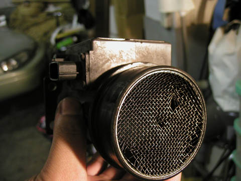 | 下流側(タービン側)の金網が破れている。 以前、タービンブローしたときに、ブレードの破片が逆流してきて刺さったのだろうか?(そんなことってあるのかな) ニスモで点検を受けた時も、このエアフロからの出力が正常でないと診断されていた。 |
